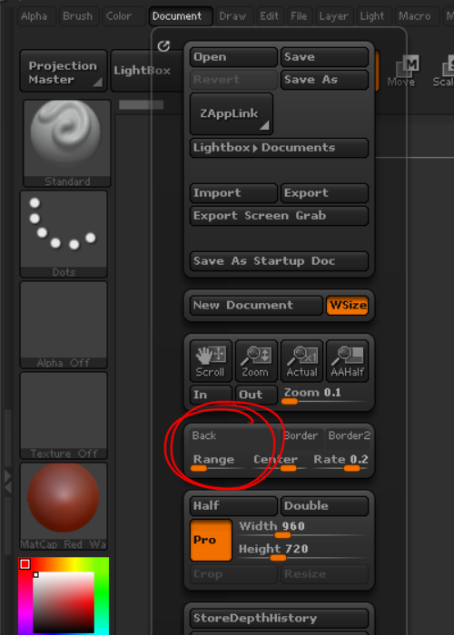 1)상단의 document 메뉴에서 아래 표시한 range 수치를 줄이면 캔버스의 배경 색상을 단색으로 설정합니다.