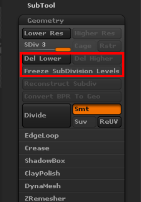 2)trim 브러쉬를 사용하려면 subtool의 섭디비젼(subdivision) 레벨이 단일해야합니다. 섭디비젼을 삭제하거나(del higher, del lower) freeze subdivision levels를 활성화한 상태에서 사용합니다.