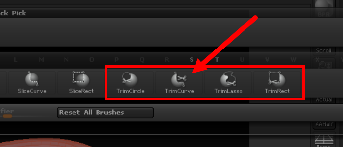 5)이중 trim 브러쉬는 TrimCircle, TrimCurve, TrimLasso, TrimRect입니다. TrimCurve 브러쉬를 선택합니다.