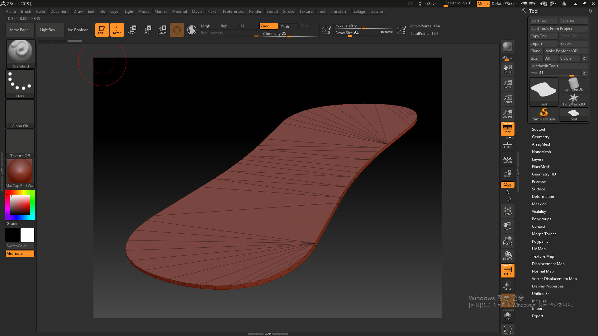 2)지브러쉬에서 오브젝트를 가져오기하고(import) 와이어프레임을 표시합니다(shift+p)