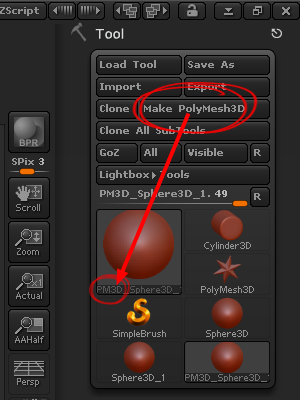 2)Tool 팔레트 상단의 Make PolyMesh3D를 클릭합니다. 스컬핑이 가능한 PM3D 오브젝트가 생성된것을 확인할수있습니다.