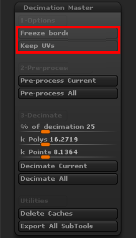 5)옵션중 freeze borders를 활성화하면 오브젝트의 border(경계)는 decimation 처리하지않습니다.