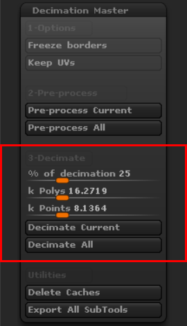 decimate current는 현재 선택한 subtool에 대해서 실행하고 decimate all는 visible상태인 모든 subtool에 대해서 실행합니다.