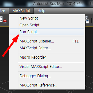 5)3D맥스를 실행하고 상단의 MAXScript 메뉴에서 run script를 선택합니다.