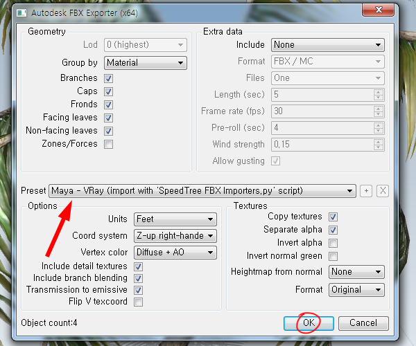 4)내보내기 옵션의 preset에서 Max - VRay를 선택합니다.