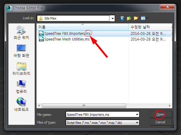 6)스피드트리에서 제공하는 speedtree fbx importers 스크립트를 열기합니다.