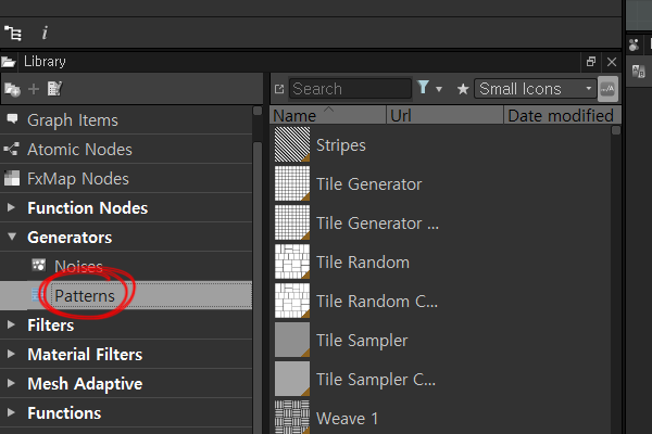 2)generators의 patterns에서 타일 제너레이터(tile generator)를 포함한 다양한 종류의 패턴 유형 노드들을 확인할수있습니다.