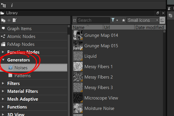 1)라이브러리(Library)에서 기본적으로 제공되는 노드들을 확인할수있습니다. generators의 noises에서 다양한 종류의 노이즈 유형 노드들을 확인할수있습니다.