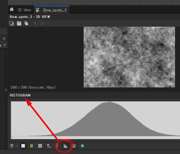 1)2D View에서 아래 표시한 아이콘을 클릭하면 선택한 2D 텍스처 이미지의 히스토그램을 표시합니다. histogram은 이미지의 그레이스케일 분포도를 나타냅니다. 아래 예에서 이미지는 전반적으로 중간톤(midtone)인것을 확인할수있습니다.
