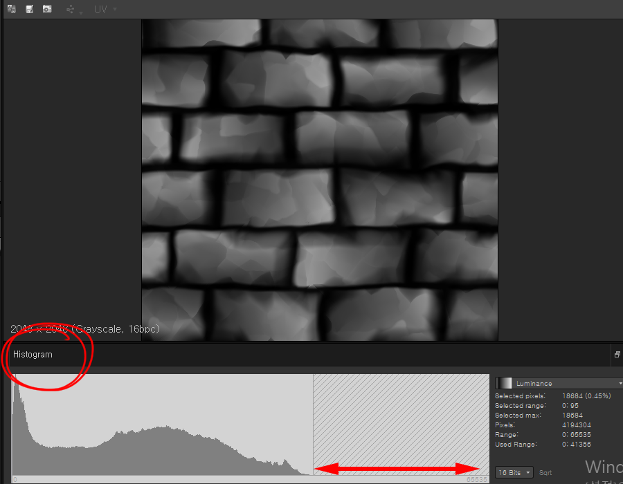1)아래 텍스처 이미지의 히스토그램에서 밝은 톤이 존재하지않는것을 확인할수있습니다.