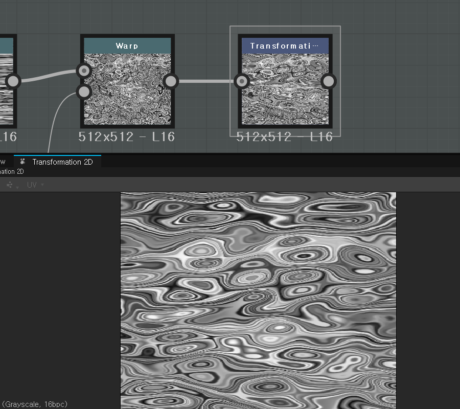 4)transformation 2D 노드를 추가하여 텍스처를 가로 방향으로 늘입니다.