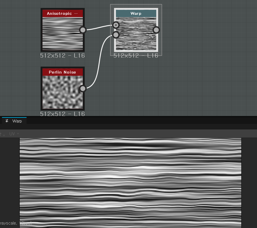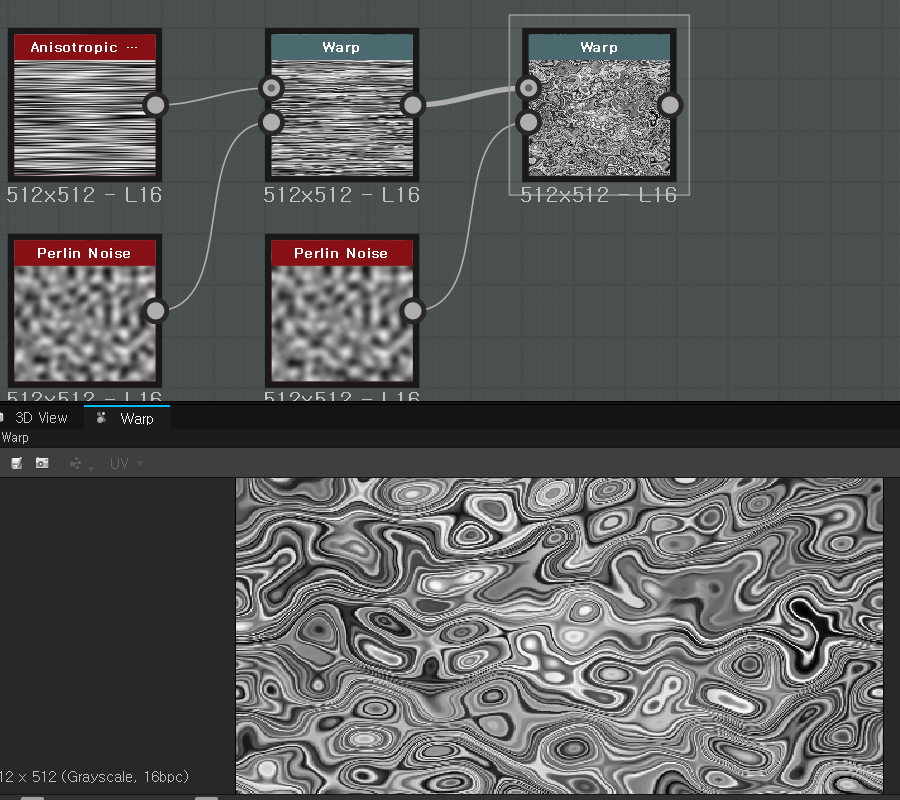 2)perlin noise 노드와 warp 노드를 추가합니다. perlin noise를 warp의 gradient input으로 사용합니다.
