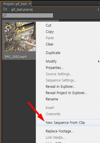 3)동영상을 선택하고 마우스 우클릭한후 new sequence from clip을 선택합니다.