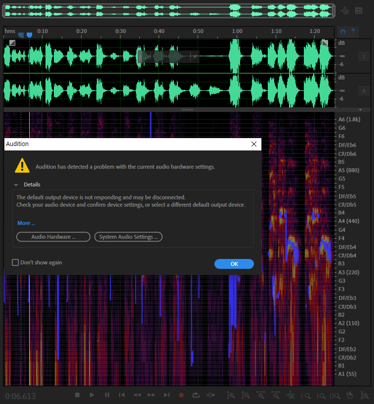 1)오디션 프로그램에서 오디오가 출력되지않는경우 또는 프로그램 실행시 아래와 같은 메시지가 표시된다면 오디션의 오디오 하드웨어를 재설정해야한다.