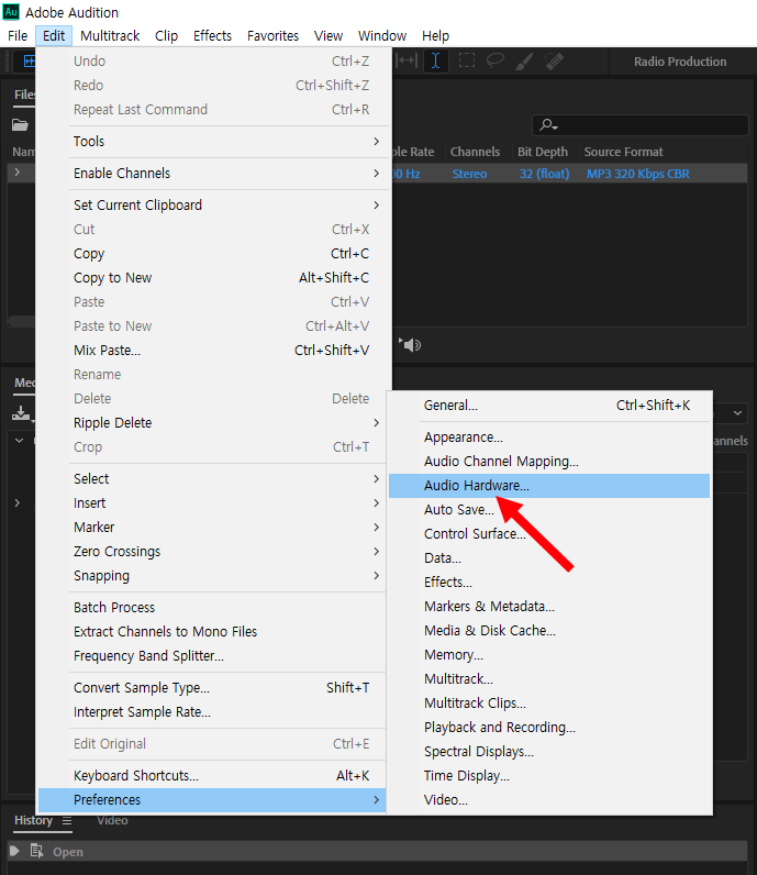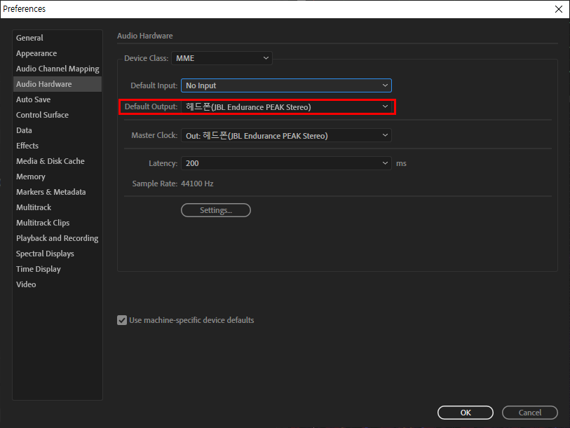 어도비 오디션(audition)에서 오디오 출력 하드웨어 설정하기(헤드폰)