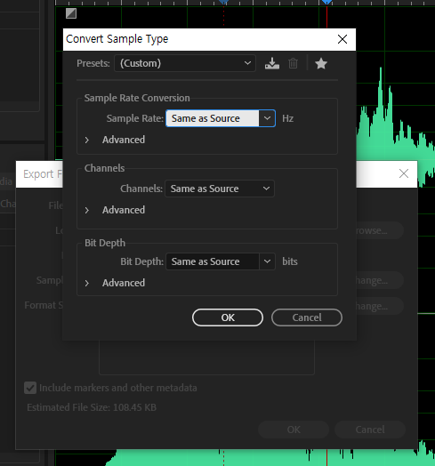 5)오디오의 sample rate, 채널(channels), bit depth를 설정합니다.