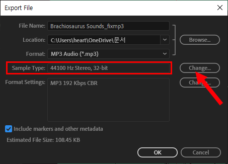 2)파일 이름(file name), 저장위치(location), 포맷(format), 샘플 유형(sample type), 포맷 세팅(format settings)을 설정합니다.
