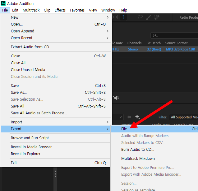 어도비 오디션(audition)에서 오디오 내보내기(export)