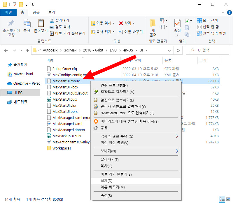 아래 경로에 있는 MaxStartUI.mnus 파일을 제거한다.