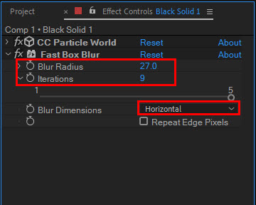 11)blur radius, iterations 수치를 입력하고 blur dimensions에서 horizontal을 선택합니다.
