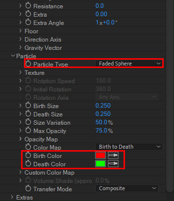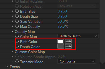 birth, death color는 파티클 방출의 시작과 끝의 색상을 설정합니다.