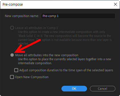 3)move all attributes into the new composition에 체크한후 확인합니다.