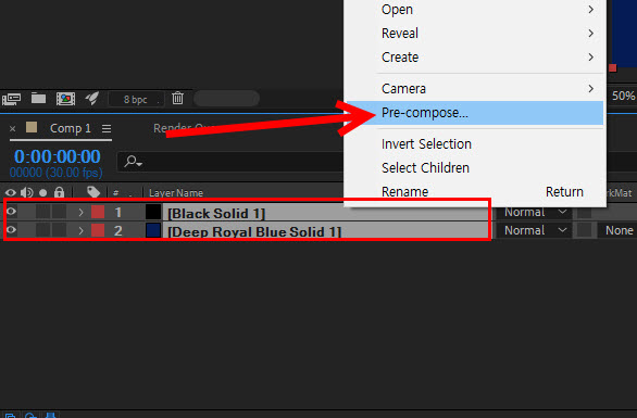 2)두개의 레이어를 선택하고 마우스 우클릭한후 pre-compose를 선택합니다.