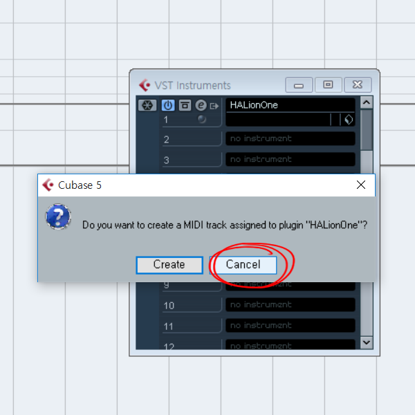 6)추가한 HALionOne를 사용하는 새로운 트랙을 생성할것인지 묻는 대화상자가 표시됩니다. 이미 트랙을 추가했음으로 cancel를 선택합니다.