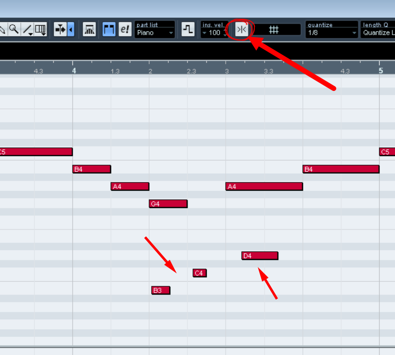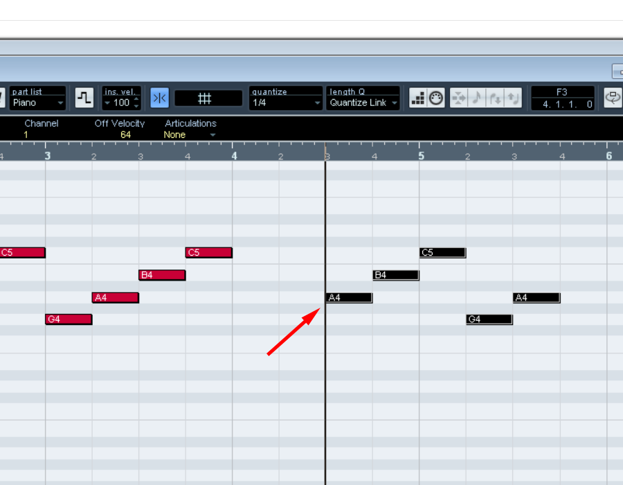 5)빈 칸에 클릭해서 key를 작성합니다. quantize가 기본값(1/4)으로 설정되어 한마디에 4개의 키를 입력할수있습니다.