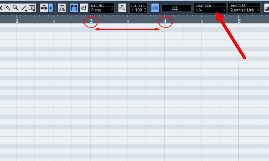 4)아래에서 굵은 텍스트로 표시된 숫자간은 한 마디를 의미합니다. 상단 우측의 quantize는 한 마디를 몇개의 칸으로 분할할지 설정합니다(기본값1/4)