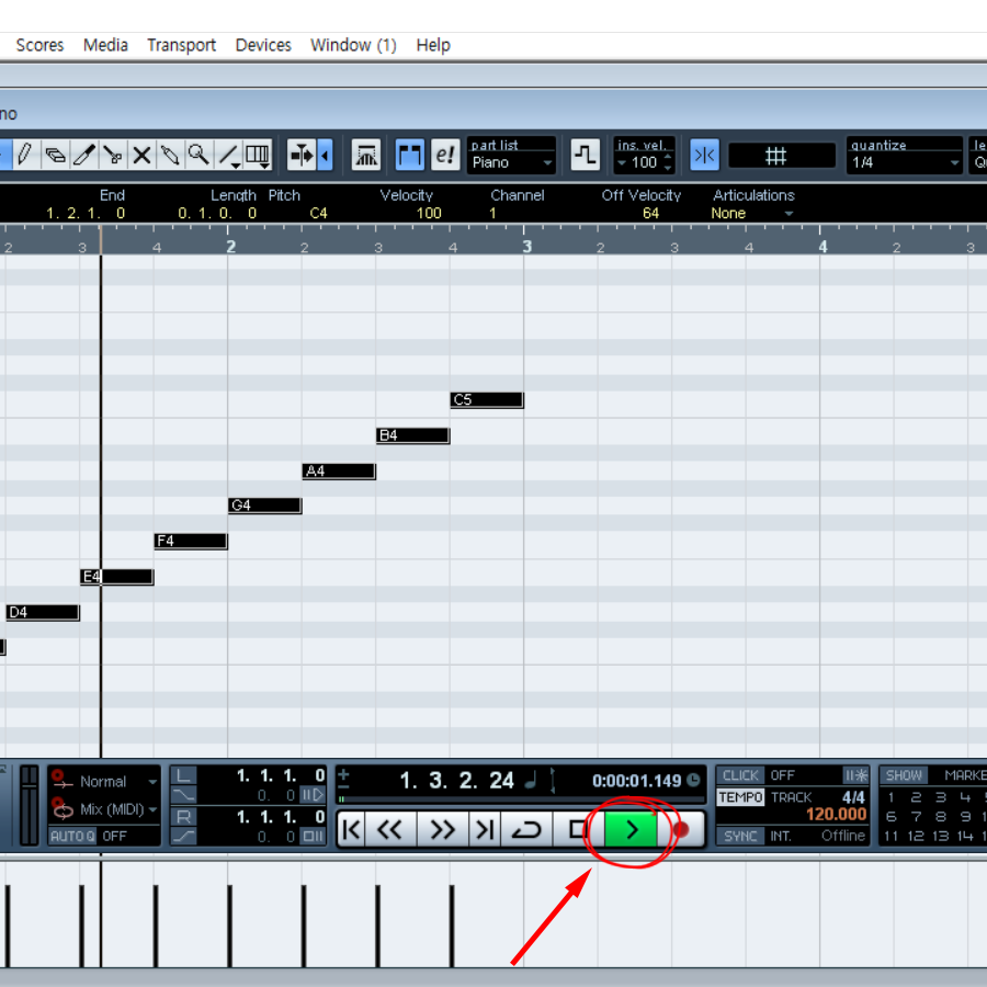 7)하단에 있는 transport 패널에서 작성한 key를 재생합니다. transport 패널에서 주요 transport 기능과 재생 및 녹음과 관련된 여러 옵션을 사용할수있습니다(transport의 transport panel, 단축키 f2)