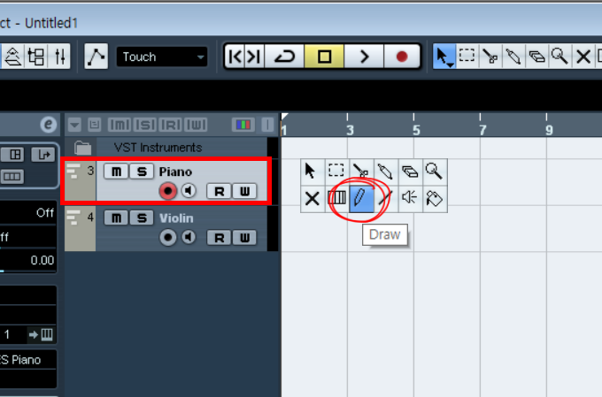 1)키를 작성할 트랙을 선택합니다. 마우스 우클릭하면 나오는 툴 메뉴에서 draw를 선택하면 마우스 커서의 모양이 변합니다.