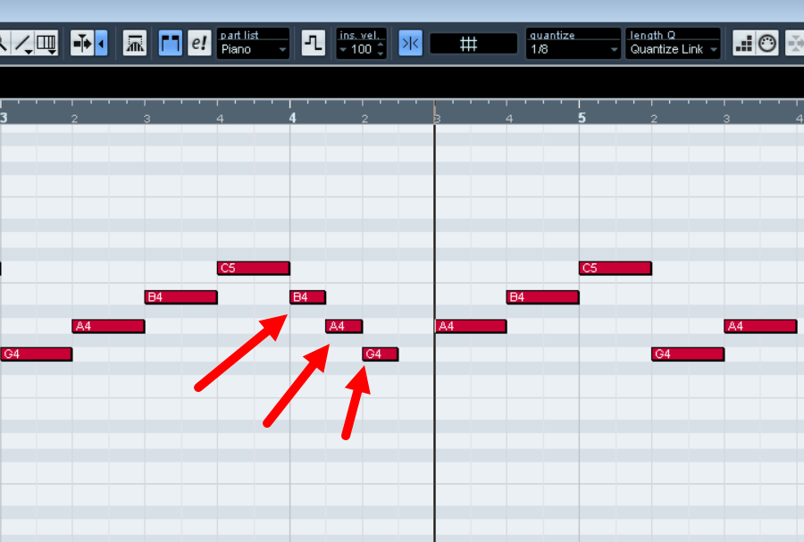 5)빈 칸에 클릭해서 key를 작성합니다. quantize가 기본값(1/4)으로 설정되어 한마디에 4개의 키를 입력할수있습니다.