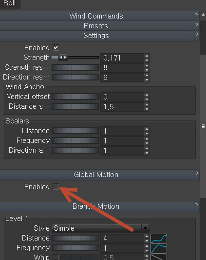 4)나무의 잎(leaf)만 바람의 영향을 받게하려면 global motion의 enabled를 체크 해제합니다.