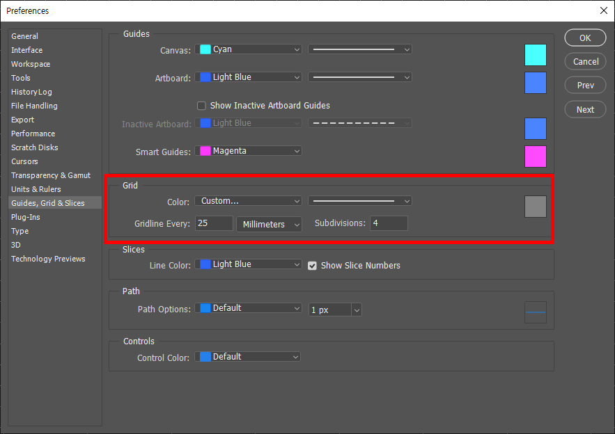 3)grid에서 격자의 간격, 색상을 선택하고 확인합니다.