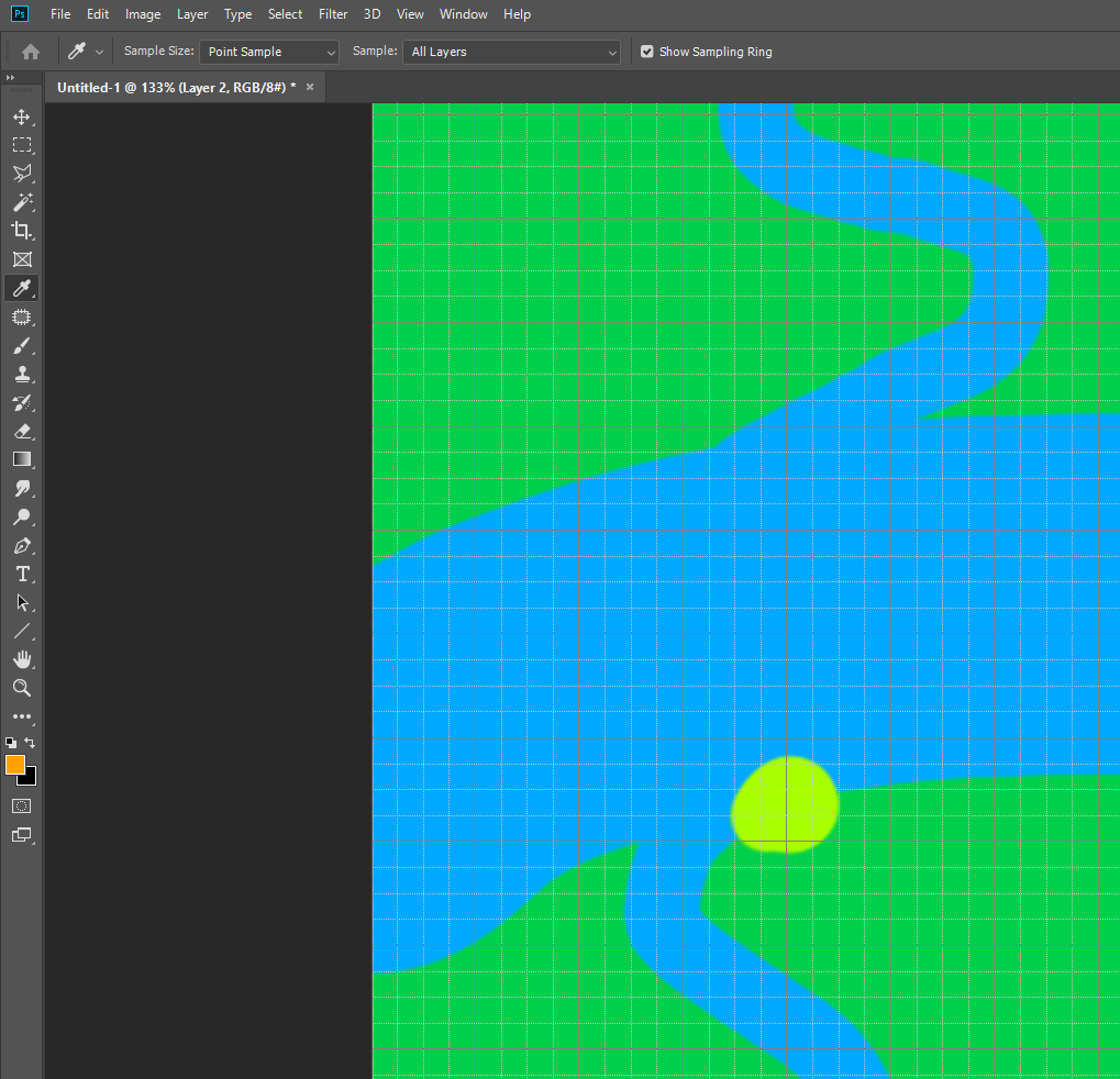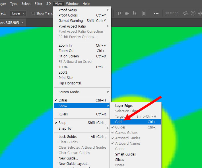 1)포토샵에서 캔버스에 그리드(grid)를 표시하려면 상단의 view 메뉴에서 show의 grid에 체크합니다.