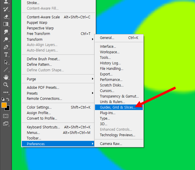 2)격자의 간격, 색상등을 설정하려면 상단의 edit 메뉴에서 preferences의 guides, grid & slices로 이동합니다.