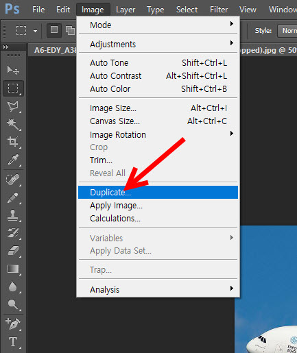 1)작업중인 문서에 대해 상단의 image 메뉴에서 duplicate를 선택합니다.