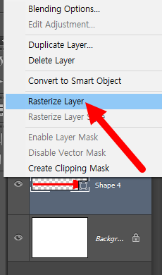 9)shape layer를 마우스 우클릭하고 rasterize layer를 선택하여 픽셀 레이어로 설정합니다.