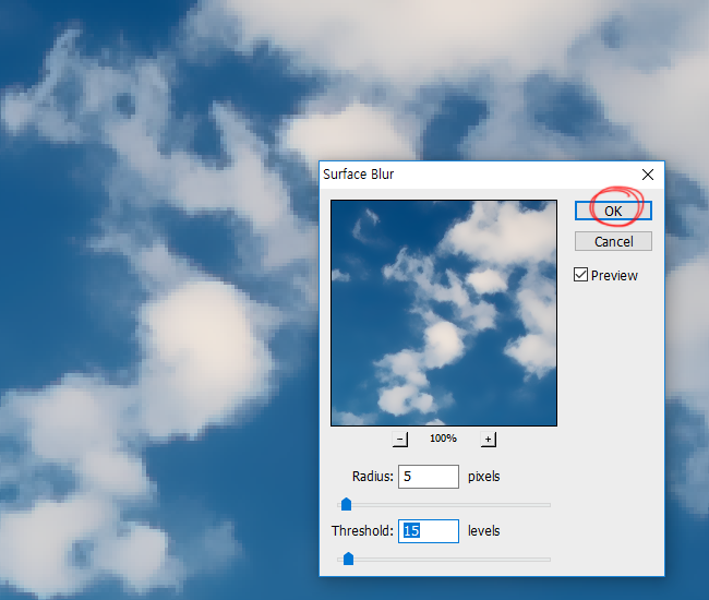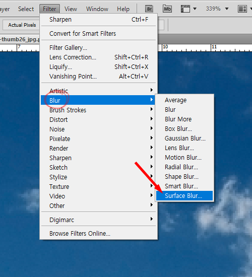 5)상단의 filter 메뉴에서 blur의 surface blur로 이동합니다.