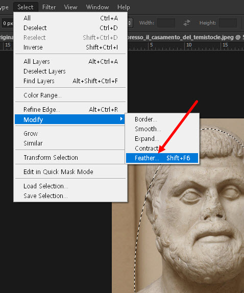 4)상단의 select 메뉴에서 modify의 feather로 이동합니다.