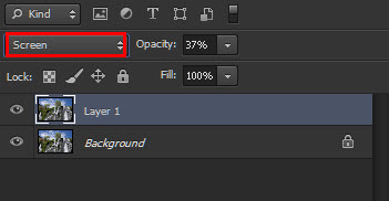 5)레이어의 혼합 방법(blend mode)을 screen으로 변경하고 레이어의 opacity를 낮춥니다.