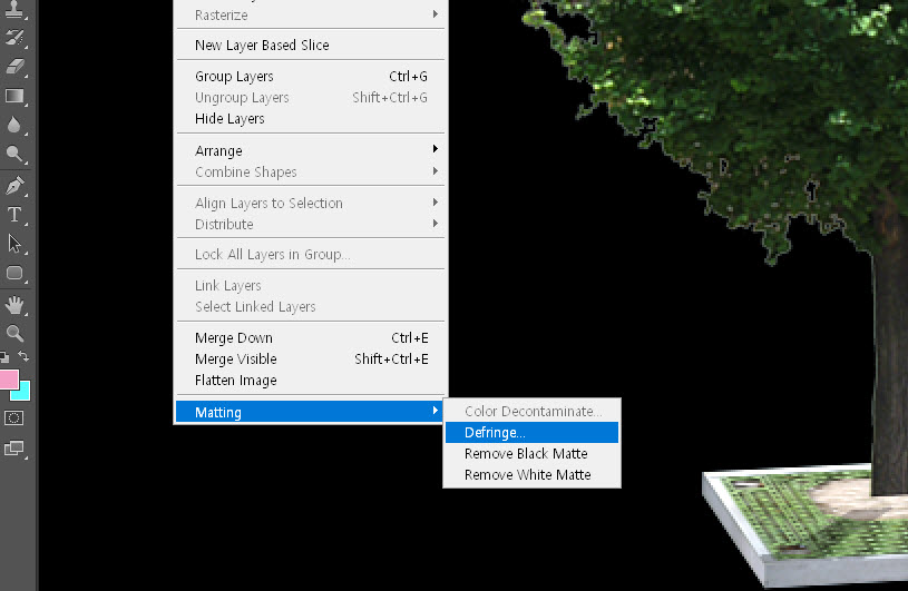 3)이미지 레이어를 선택하고 상단의 layer 메뉴에서 matting의 defringe를 선택합니다.