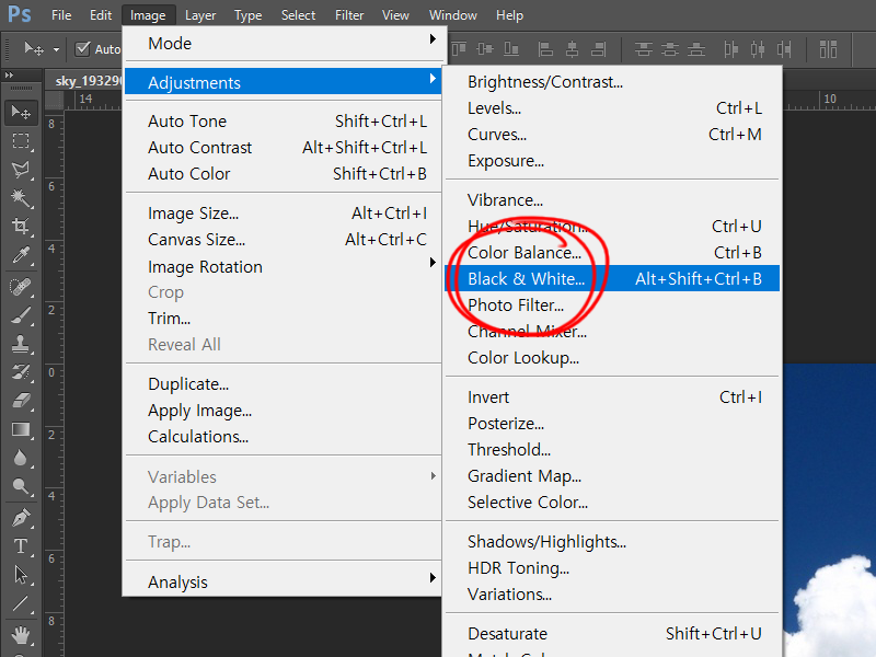 2)이미지를 선택하고 상단의 image 메뉴에서 Adjustment의 black&white로 이동합니다.