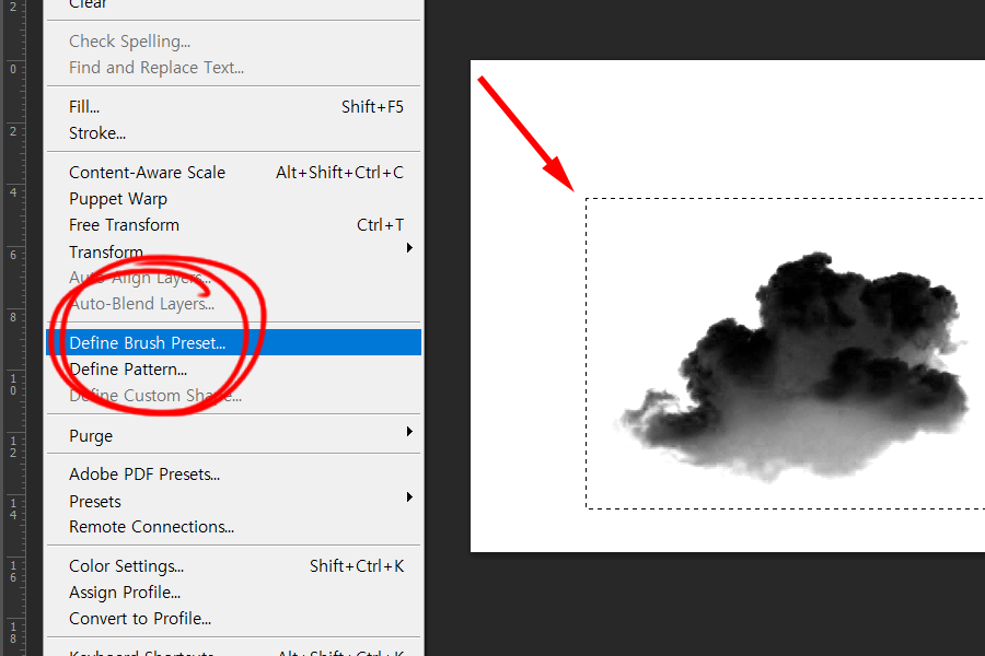 5)구름의 영역을 선택하고 상단의 edit 메뉴에서 define brush preset를 선택합니다.