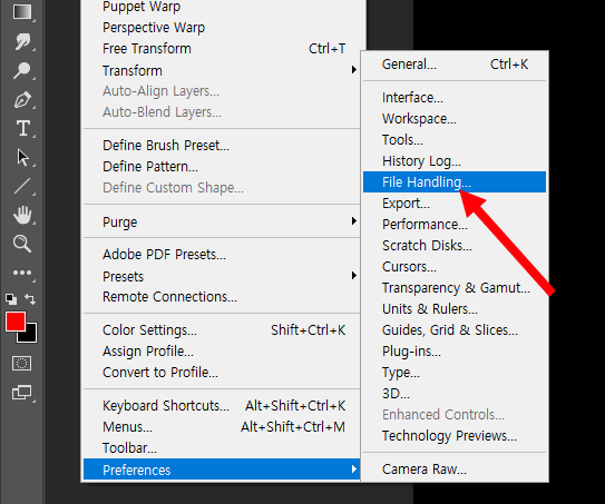 1)상단의 edit 메뉴에서 preferences의 file handling로 이동합니다.