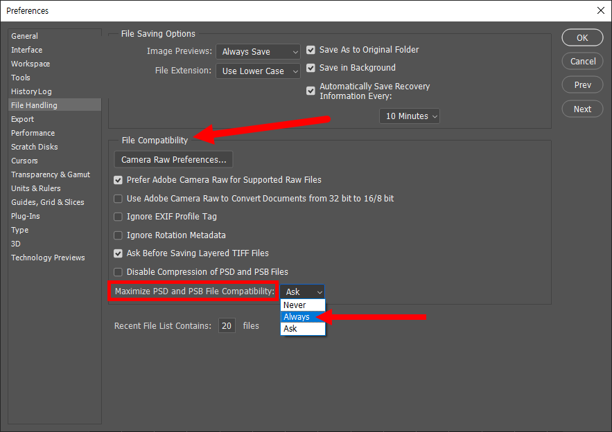2)file compatibility의 maximize PSD and PSB file compatibility에서 always를 선택하고 확인하면 이후에 저장한 psd 파일을 이전 버전의 포토샵에서 열기 가능합니다.