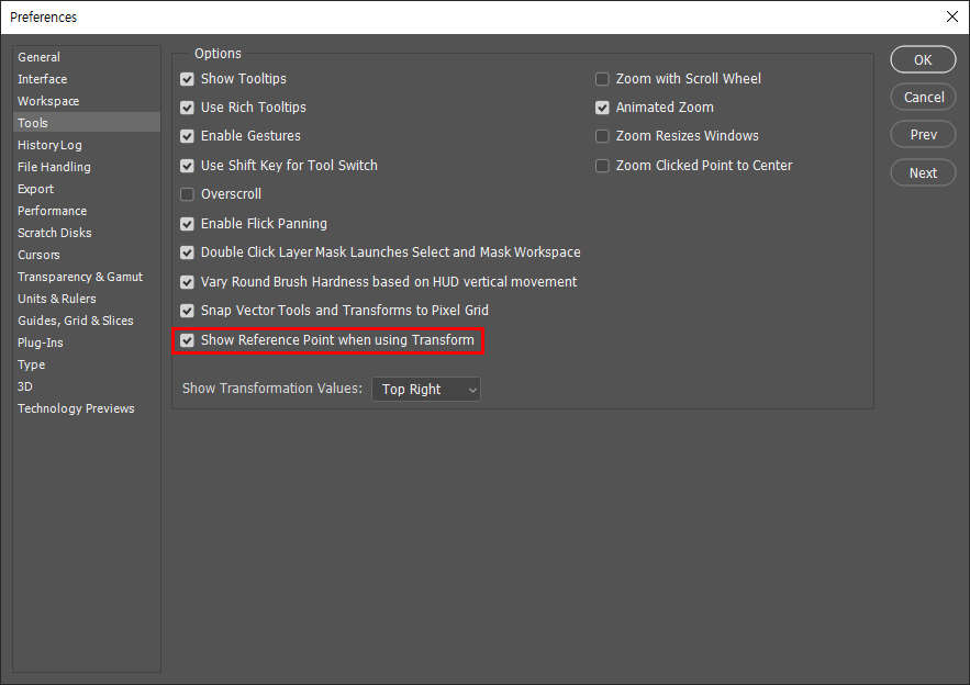 2)preferences에서 좌측의 tools를 선택하고 show reference point when using transform에 체크되어있는지 확인합니다.