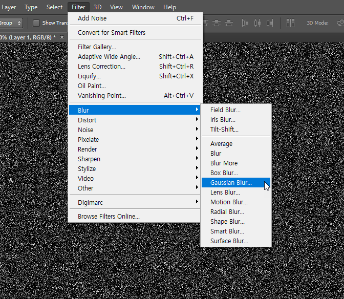 4)이미지에 블러를 적용합니다. 상단의 filter 메뉴에서 blur의 gaussian blur를 선택합니다.