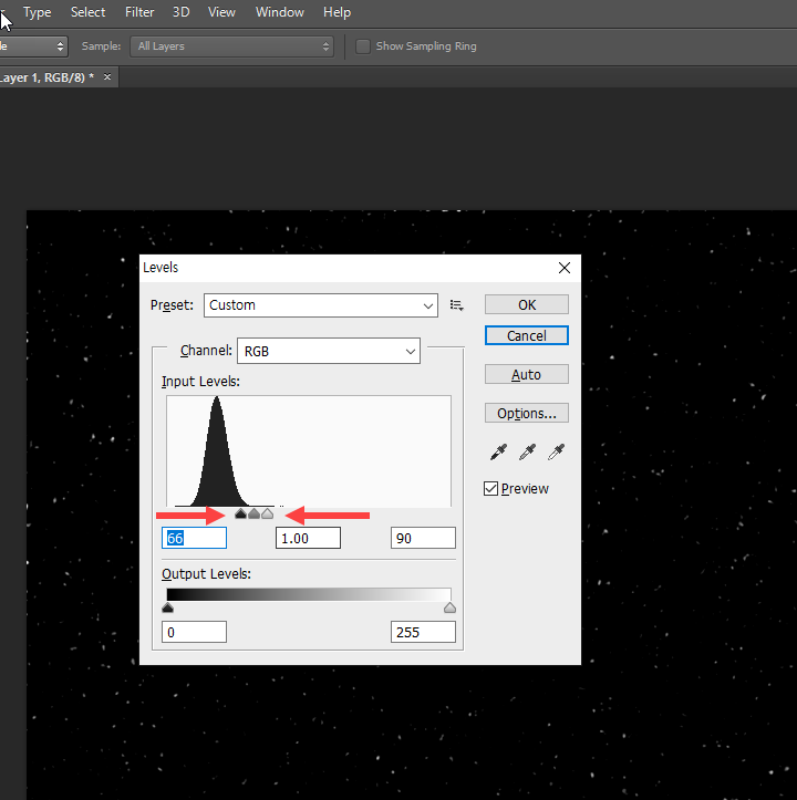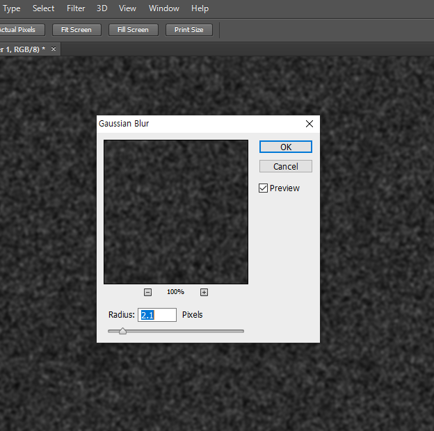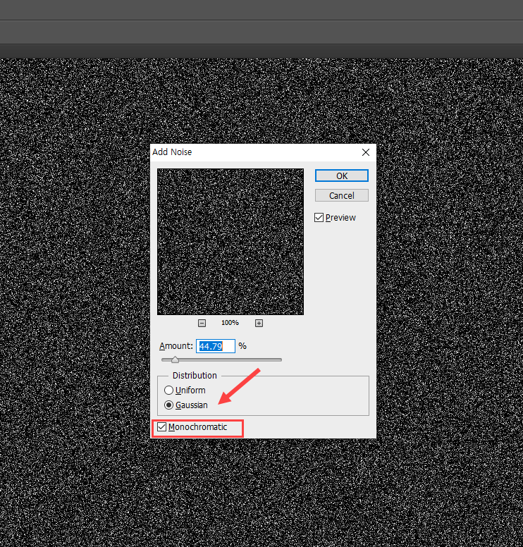 3)gaussian, monochromatic에 체크하고 amount 수치를 조절한후 확인합니다.